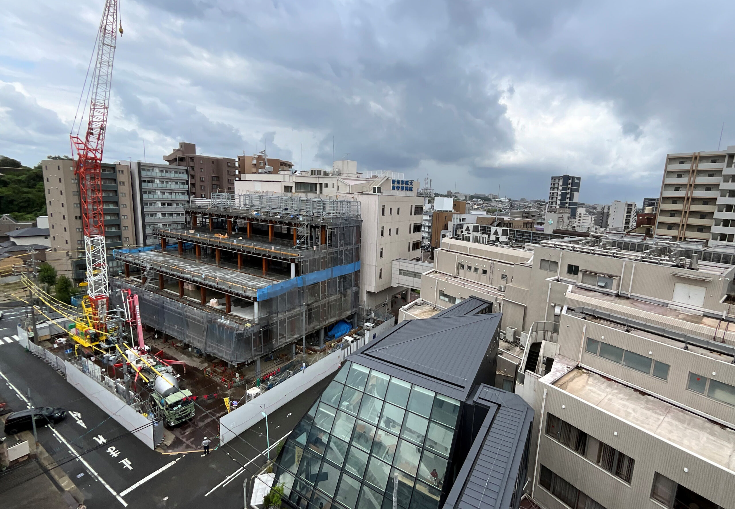 令和8年春、末盛キャンパスに病院の「新棟(北館)」が完成します。新棟(北館)では「医科・歯科連携強化と医科医療サービス拡充」を目的として、末盛キャンパス全体の環境向上を目指します。地上5階・地下1階の新棟(北館)は、周辺への圧迫感を低減する階段状で、洗練された曲面デザインの建物となります。